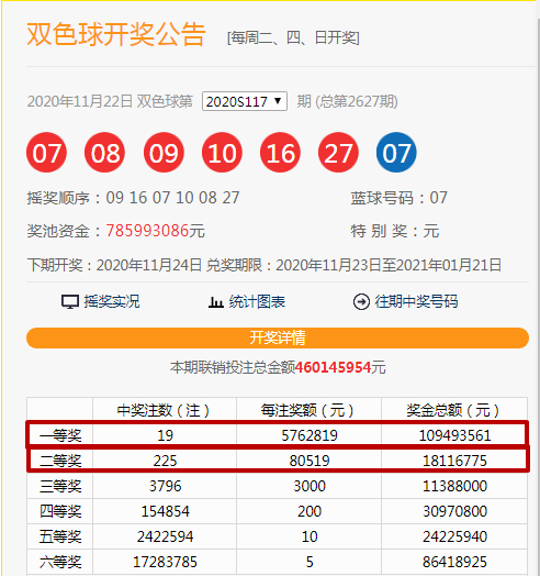 11月22日晚,中國福利彩票雙色球游第2020117期開獎,這是今年雙色球12億元大派獎活動第七期派獎。當期雙色球紅球號碼為07、08、09、10、16、27,藍球號碼為07。10注一等獎特別獎887萬多元,六等獎翻番獎1128萬多注,當期雙色球頭獎19注,其中10注為一等獎特別獎,單注獎金為887萬多元(含派獎311萬多元)。這10注一等獎特別獎花落7地,山西1注,黑龍江1注,安徽2注,山東2注,湖北1注,廣西1注,寧夏2注;另外9注為一等獎普惠獎,單注獎金為631萬多元(含派獎55萬多元)這9注一等獎普惠獎花落8地河北1注,遼寧1注,浙江2注,安徽1注,福建1注,江西1注,山東1注,廣東1注。當期二等獎開出225注,單注金額8萬多元,其中山東的兩注一等獎特別獎被青島彩民斬獲。這2注一等獎出自一張投注額20元的自選單式(2倍)彩票對5注號碼分別進行2倍投注,幸運中得2注一等獎來自市北區(qū)大名路44號7號樓7號網(wǎng)點,福彩37020121銷售站。