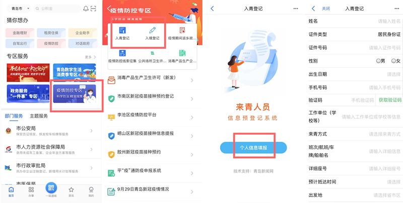 相關人員來青返青后,除第一時間主動向所在社區(村居)或企業(單位)報到外,還要登錄“青島市入境人員信息系統”或“來青人員預登記系統”,如實申報登記有關信息。計劃來青返青的入境人員,由其親友或其親友告知本人提前72小時登錄“青島市入境人員信息系統”,如實申報登記有關信息。入青返青人員可在“愛山東·青e辦”直接進行信息申報,步驟如下。