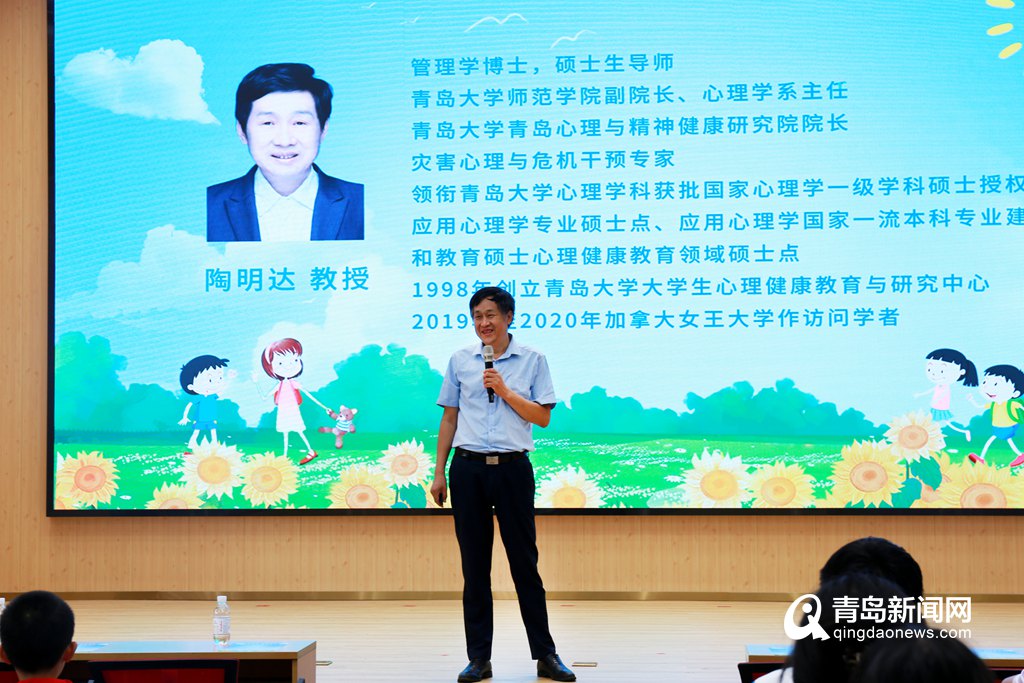 伴隨著活力十足的尤克里里彈唱《小手拉大手》上演,青島市全環境立德樹人心理健康宣傳教育活動正式拉開帷幕。詩歌朗誦《向上吧 少年》充分展示了我市青少年朝氣蓬勃、奮發向上的精神風貌。儀式現場介紹了六大板塊、17項活動內容,公布了我市開通的未成年人心理熱線和未成年人心理健康輔導中心、輔導站的聯系方式,號召全市教師、家長、學生主動參與、積極體驗、快樂分享、共同提高。啟動儀式在手勢舞《一起向未來》的精彩演繹中結束。隨后,青島大學心理學教授陶明達為現場老師、家長及學生們,帶來了全環境立德樹人心理健康宣講《家庭中的親子關系與美好生活構建》,受到師生家長們的一致好評。